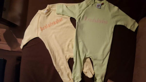 Weiter gehts mit Geschenken von Oma Annett ;) Posted on 15. März 201515. März 2015 by helmut Zwei Strampler mit den Aufdrucken „Schlafräuber“ und „Frechdachs“