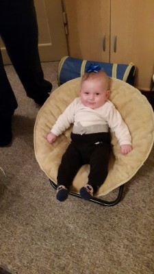 Opa hat uns dann vom Dresdner Flughafen abgeholt und wir fuhren dann noch eine Stunde nach Finsterwalde. Dort ganz erschöpft angekommen haben dich erstmal alle ganz genau bestaunt und Oma war ganz erschrocken wie groß du doch schon geworden bist 😮😍 danach hast du gleich den „Katzensessel“ ergattert in den Dich Mama reingesetzt hat 😀 es hat dir sichtlich gefallen darin zusitzen 😊 und da ja Weihnachten war, hat Papa dir ein blaues Schleifchen auf den Kopf gelegt, als Geschenk für Oma und Opa 😃