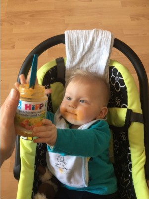 Deine Fläschen und Gläschen schmecken zwar gut aber zwischen drin mal was neues ist doch auch toll 😊 und Tante Jessy hatte die Idee dir eine leckere Wiener zugeben. Mama hat die Haut ein bisschen abgekaut und schwups hattest du sie auch schon im Mund und hast drauf los gelutscht und gekaut 😋 es hat dir sehr geschmeckt, denn du wolltest sie nicht mehr hergeben 😄