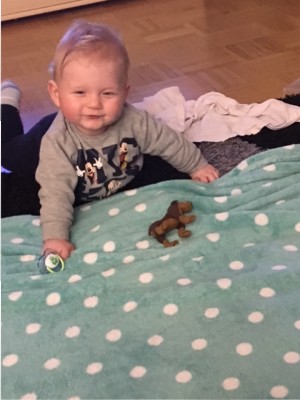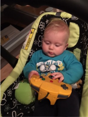 Papa hat dir einen Ninteno Kontroller gegeben als er die Kisten für den Umzug gepackt hat 😁 Noch ein bisschen groß für deine kleinen Händchen aber du fandest ihn trotzdem total interessant ❤️